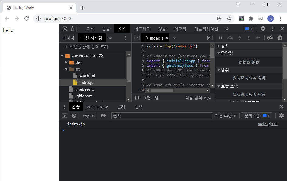console에서 생성해준 javascript 코드를 index.js에 붙여넣기 한다.