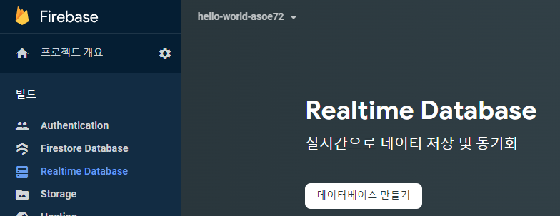 firebase console에서 빌드 - Realtime Database 선택 - '데이터베이스 만들기' 버튼 클릭