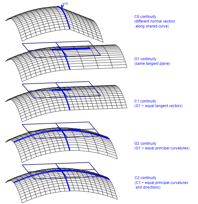 단일 surface에 대해, 두 surface의 연결 (위 그림)은 각 교점(intersection point)에서만 연속성(continuity)을 정의한다. 연결의 smoothness는 교점의 연속성의 최소값이다.
