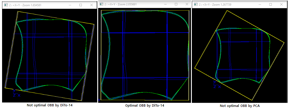 1. Creation of OBB from set of points 절에서 설명된 알고리즘이 Creation of OBB based on Axes of inertia 알고리즘 보다 훨씬 잘 동작하고 (더 적은 surface의 OBB 생성), 더 빠르다. 그럼에도 불구하고, (일반적으로) 두 알고리즘의 결과는 항상 optimal은 아니다. 더우기, 첫 메소드는 복잡한 geometry의 shape의 OBB 계산은 불가하다.