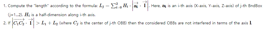 적어도 한 축(15개 중)에서 간섭이 없을 경우, OBB는 전혀 간섭이 없다.